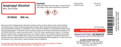 View full details500mL bottle of isopropyl alcohol ACS-grade material for lab and research use Used as a solvent Each bottle has safe handling and storage procedur...