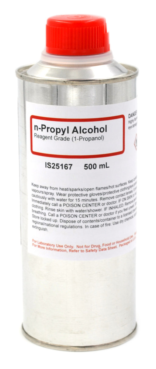 500mL bottle of n-propyl alcohol Reagent-grade material for lab and research use Used as a solvent Perfect for use in any chemistry lab or classro...