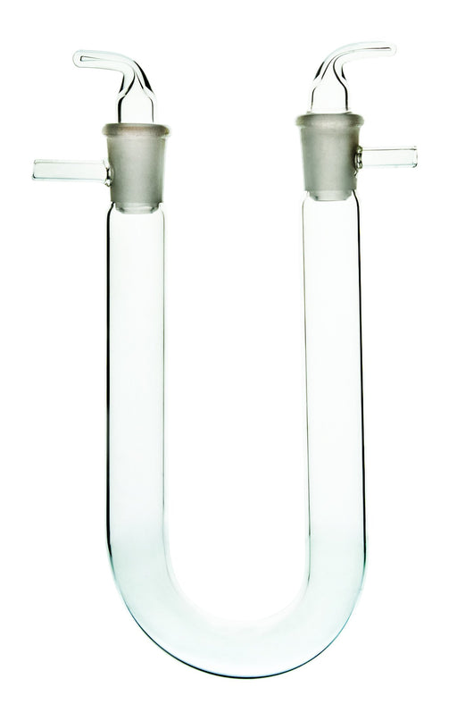 Borosilicate glass with side tubes. Limbs closed by hollow ground in key stoppers which, when rotated open or seal the sides tubes. Length 125mm, D...
