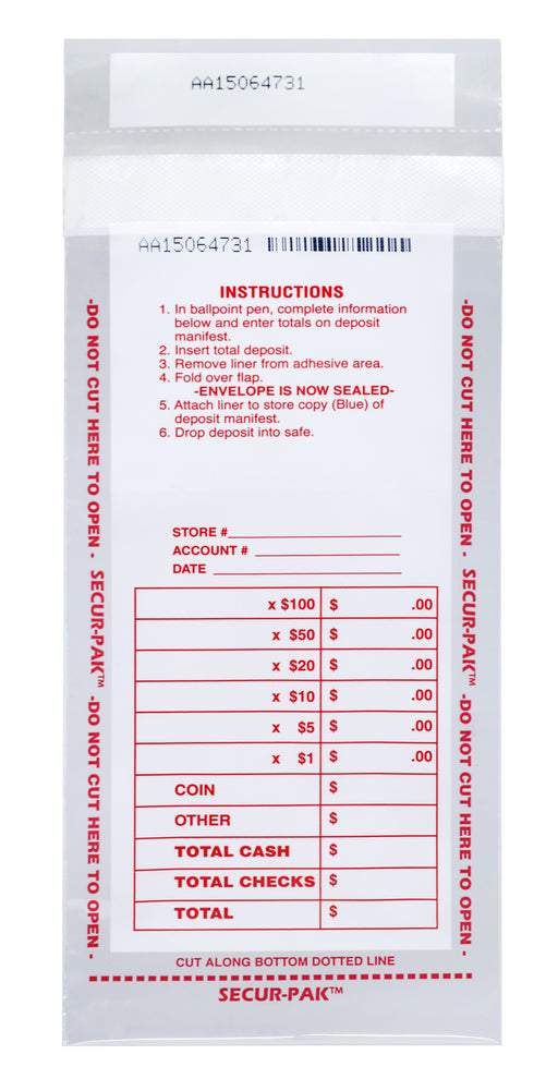 Pack of 100, 4.5" x 9" Secur-Pak Deposit Bags. Sized for drop deposit slots and safe slots. Federal Reserve Compliant. Transparent, 2.5 mil, tear-resistant, co-extruded polyethylene film. 100% recyclable. Self sealing, tamper resistant enclosure, and non-smear writing block to label contents.